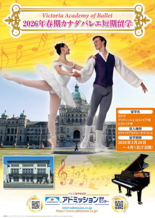 | ●留学先:カナダ、ビクトリアアカデミーオブバレエ ●期間:2026年3月26日~4月1日 詳細については資料請求ボタンをクリックして下さい。 ![]() 多くの日本人留学性が卒業後海外のバレエ団に入団しています |